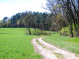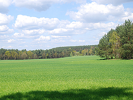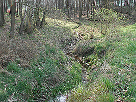 Sie wandern zwischen den Feldern auf ein schmales Waldstück zu. Vor diesem Waldstück entspringt links ein kleiner Bach, der etwa 200m rechts hinter dem Waldstück wieder versickert. In regenreichen Jahren fließt dieser Bach bis zum Herzberger See.
