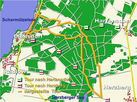 In Diensdorf gibt es eine Menge Wandermöglichkeiten. Diese dargestellte Tourenempfehlung ist sehr abwechslungsreich und im Sommer entlohnt die Tour mit einem Bad im Herzberger See. Sie können auch nach Herzberg weiter wandern, oder die mit den roten und grünen Balken dargestellten Wege nutzen. Von Fürstenwalde oder Bad Saarow können Sie mit der Buslinie 430 diesen Punkt erreichen.