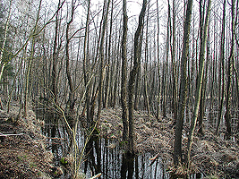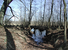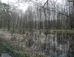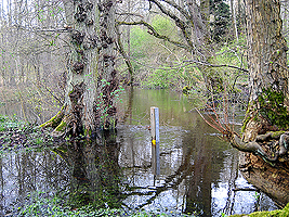 Vom "Demnitzer Mühlgraben" wandern Sie auf der Straße geradeaus weiter, die Steigung hinauf in Richtung der Autobahnbrücke. Nach etwa 150m befindet sich links ein Waldweg mit einer Schranke. In diesen biegen Sie links ab. Das Moor befindet sich zwischen der Wildheide und dem Tempelberger Forst. Auf dem Bild hat der Mühlgraben gerade sein Frühjahrshochwasser. Der Höchststand des Pegelmessers ist erreicht. |