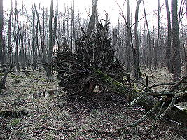 Das der Wasserstand in den letzten Jahren deutlich gestiegen ist, kann man an dem Bild erkennen. Hier ist eine Fichte durch die steigende Grundwasserschicht umgestürzt. Die während der Trockenlegung in das Moor gewachsenen Bäume sterben ab und man kann nur noch die Gerippe sehen. |