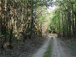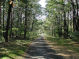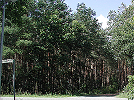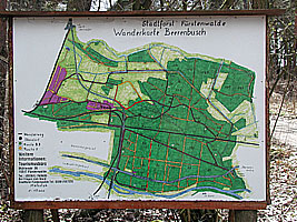 Sie wandern Richtung Osten bis zum Ende der Straße und erreichen die Tafel mit Wanderhinweisen für das Waldgebiet Beerenbusch. Der sich rechts dahinter anschließende Waldweg führt Sie auf den Damm der Umgungsstaße zu.
