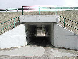 Vor der Straße halten Sie sich rechts und durchwandern den Tunnel unter der Umgehungsstraße. Nach der Tunneldurchquerung halten Sie sich links, unterqueren die Hochspannungsleitung und laufen auf die grün-weiße Schranke im Waldweg zu.