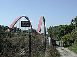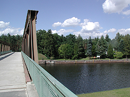 Rechts vor der Brücke finden Sie eine Schautafel vom Werdegang der Schleuse. 2006 wurde diese abgebaggert, da die Hochwasserschleuse die Funktion verloren hat. Hochwasserschleusen begrenzen die Fließgeschwindigkeit eines Kanals und werden bei den heutigen Flussschiffen nicht mehr benötigt.