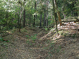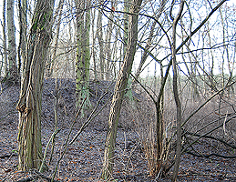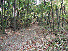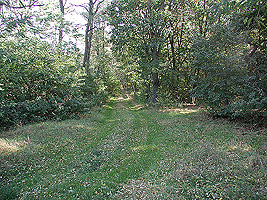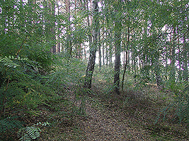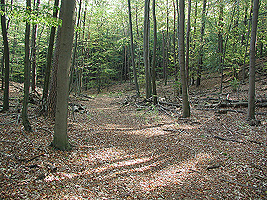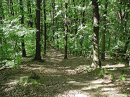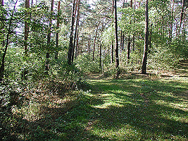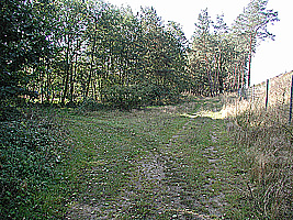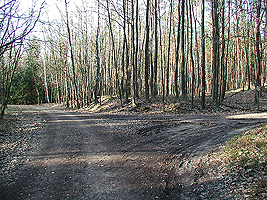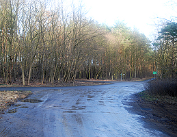 An dieser Wegkreuzung verlassen Sie nach links den Naturlehrpfad. Die links liegende Senke ist auch ein Grubenfeld.
