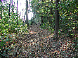 Etwa 50 m weiter kann man noch einen Bahndamm erkennen. In den Anfängen des Bergbaus wurden senkrechte Schächte in den Berg getrieben und die Kohle in seitlich aus dem Berg geholt. Der Damm stammt noch aus dieser Zeit. Sie folgen dem Weg in einem leichten Linksbogen. Geradeaus ist der zugewachsene Abbauweg nach Petersdorf nur am Geländeeinschnitt zu erkennen.