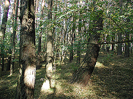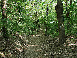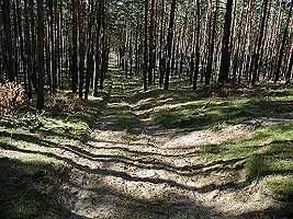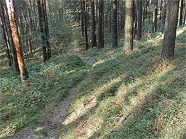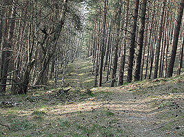 Der Aufstieg in die Dubrower Berge ist hier ein wenig anstrengend. In der Senke befinden sich einige umgestürtzte Bäume, die man übersteigen muss. Der Weg führt Sie jedoch schnell zum Bergkamm. Diesem folgen Sie dann links immer bergauf.