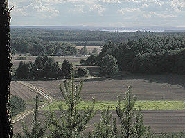 Hier hat der Wanderer noch mal einen Blick über die ganze erwanderte Strecke. Von links nach rechts kann man die Hügelketten folgender Endmoränen sehen: Lauseberge und Dubrower Berge mit der davorliegenden Getreidewirtschaft, Soldatenberge, den Dom von Fürstenwalde und die Rauener Berge.