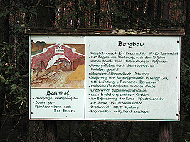 Nach der Exkursion durch den Bergbauort wandern Sie zurück zum Wegweiser und verlassen den Ort am Rauener Kindergarten. Dieser Weg ist auch durch den Bergbau entstanden. Der Geländeeinschnitt am Ortsausgang führte in den fünfziger Jahren des 19. Jahrhunders die Pferdebahn zur Großen Tränke.