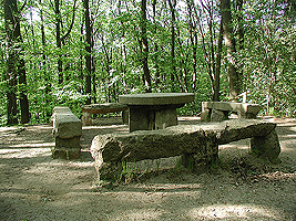 Oben macht der Weg noch eine Kurve nach links und Sie stehen am Steinernen Tisch. Die steinerne Möblierung ist aus den Resten des abgesprengten Großen Markgrafensteins entstanden.