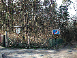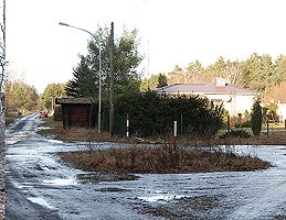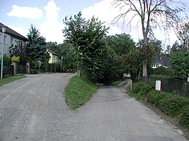 Hier am Kiesweg geht der Wanderweg rechts weiter. Die Grubenbahn führte mal mitten durch die Ansiedlung "Hinterste vier Häuser" durch. Der Straße kann man hier nicht folgen, da hinter der Spreenhagener Straße der Weg durch ein Grundstück unterbrochen ist.