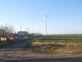 An der Geflügelfarm verlassen Sie nach rechts die Straße und überqueren den Schanzengrabenberg mit seinen vielen Windkraftanlagen.